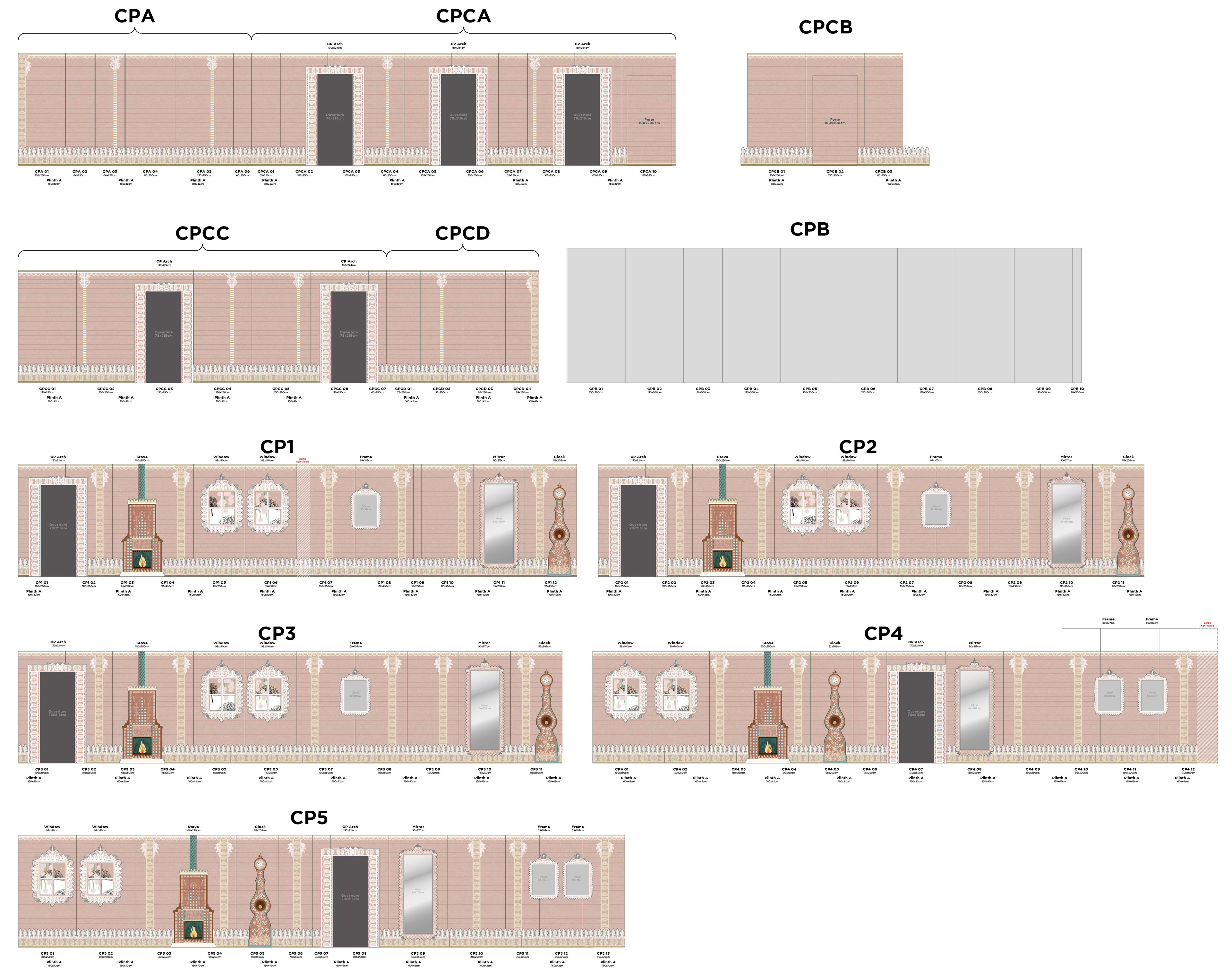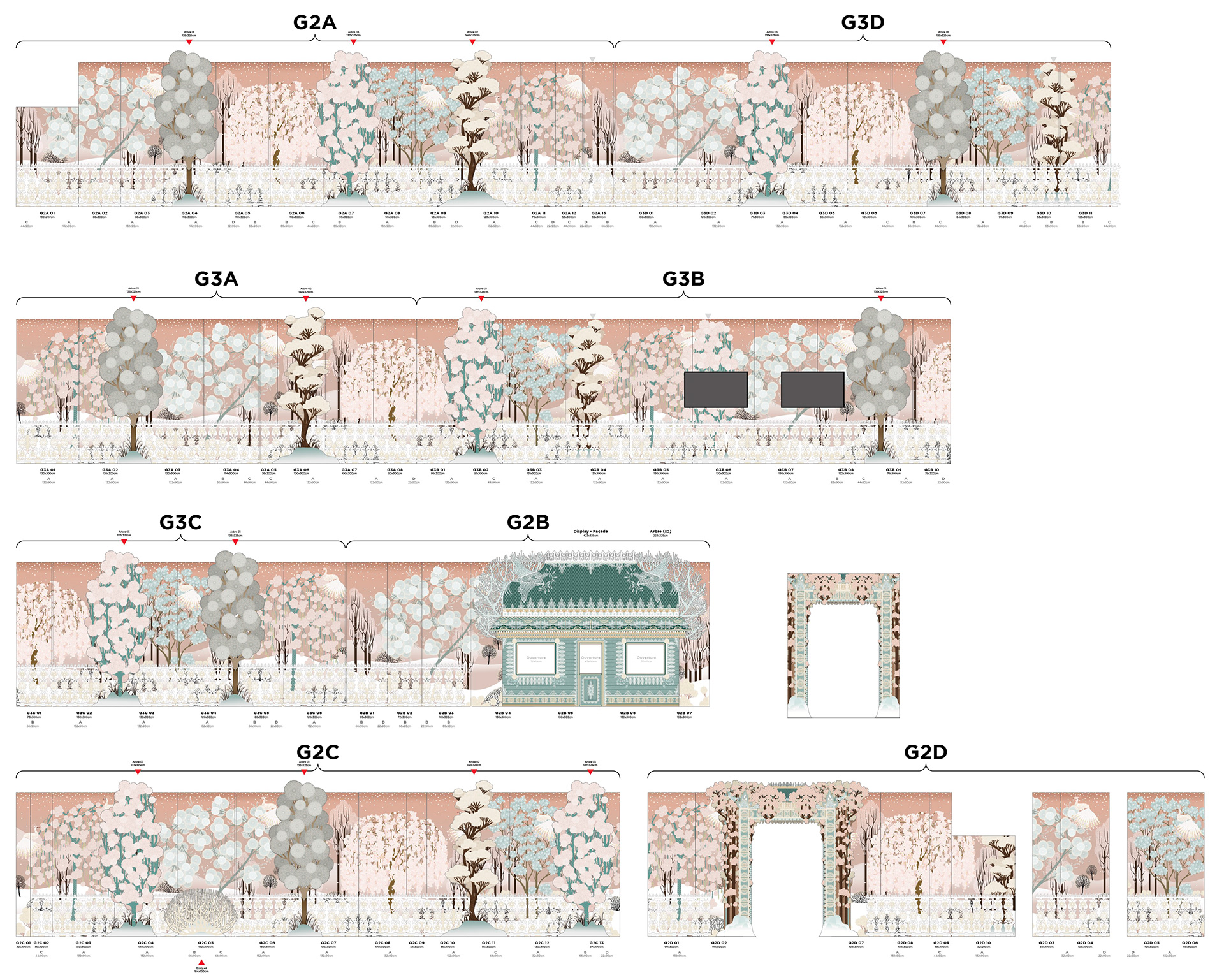 La difficulté, au delà des différentes mises à l'échelle, était le calepinage complexe des motifs avec des dimensions de panneau très variables mais surtout – pour la partie expo – le fait que je n'avais que 12m linéaire de fond existant pour couvrir environ 80m de cloisons sans que la répétition soit visible.