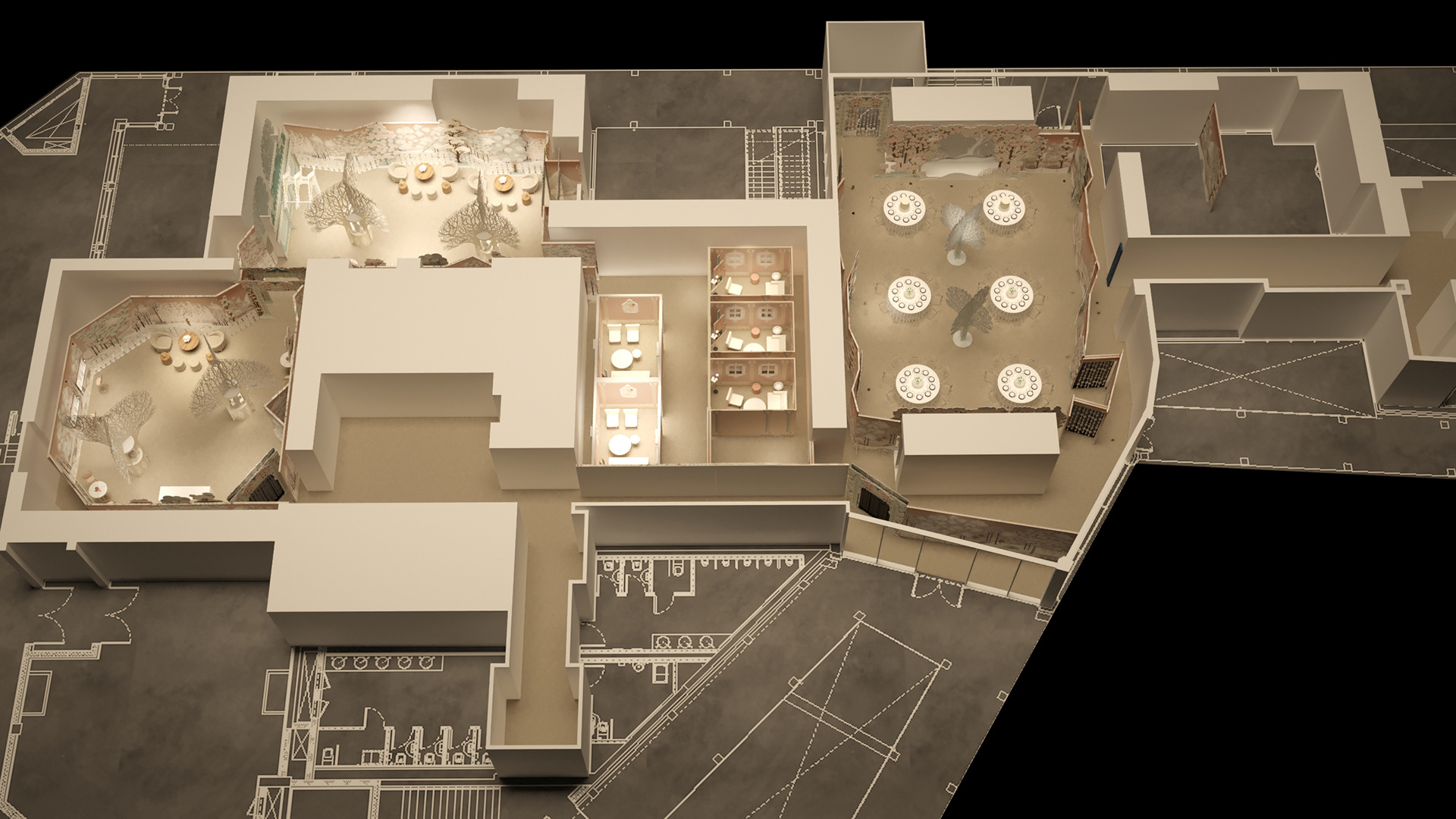 Mon travail sur ce dossier était purement technique, la création graphique des décors avait été assuré par un studio extérieur directement pour VC&A. La mission était justement d'adapter cette créa "générique" aux contraintes techniques du lieu et de la scénographie décidé par l'agence.